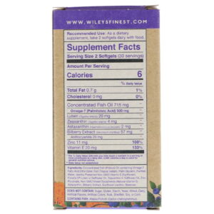 Concentrated fish (pollock) oil containing omega-7 fatty acid ethyl ester, fish (tilapia) gelatin, palm glycerin, purified water, identity preserved non-GMO vitamin E (sunflower), floraGLO lutein in safflower oil, zeaxanthin in safflower oil, zinc picolinate, non-GMO mixed tocopherols (natural vitamin E), astaxanthin, bilberry extract, sunflower lecithin, beeswax.