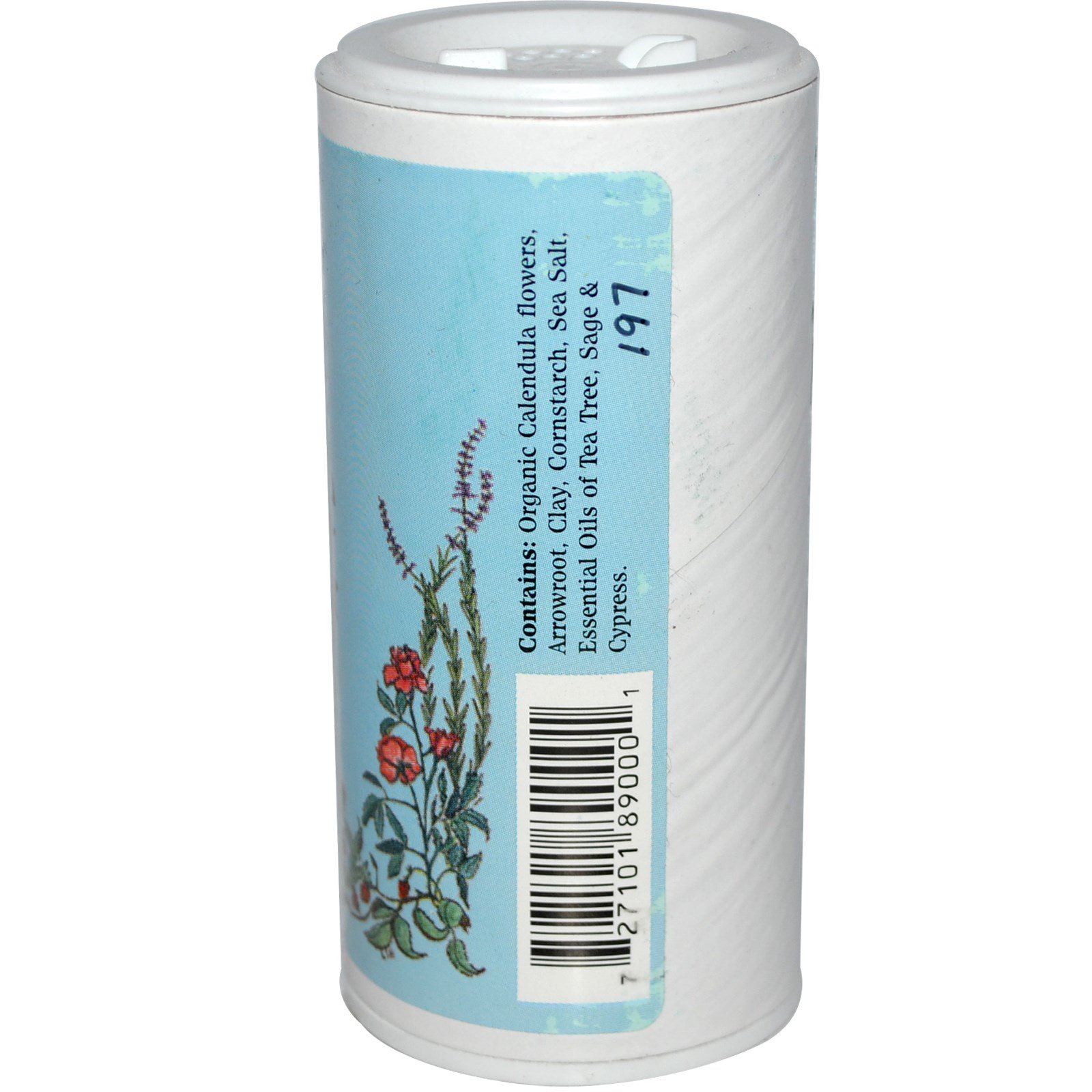 Flores de calendula orgânica, araruta, argila, amido de milho, sal marinho, óleos essenciais de árvore de chá, sálvia e cipreste.
