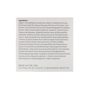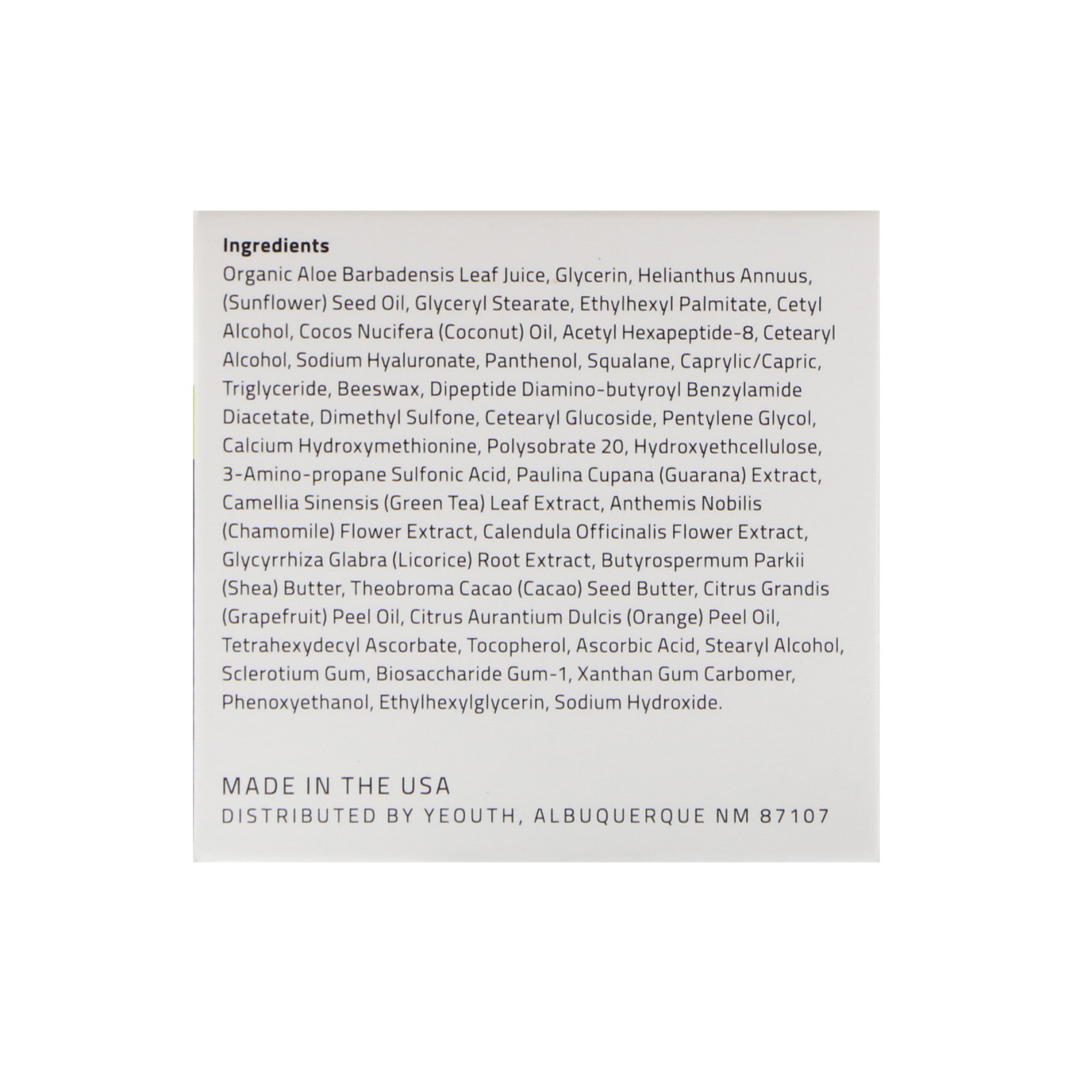 Suco orgânico de folha de aloe barbadensis, glicerina, helianto annuus (girassol), estearato de glicerila, palmitato de etilhexila, álcool cetílico, óleo de cocos nucifera (coco), acetil hexapeptídeo-8, álcool cetearílico, hialuronato de sódio, pantenol, esqualano, caprílico / cáprico triglicérides, cera de abelha, dipeptídeo diamino-butiril benzilamida diacetato, dimetilsulfona, cetearil glicosídeo, pentileno glicol, hidroximetionina de cálcio, polissorbato 20, hidroxietilcelulose, ácido 3-amino-propano sulfônico, extrato de paulina cupana (guaraná), folha de camélia sinensis (chá verde) extrato, extrato da flor do anthemis nobilis (camomila), extrato da flor do calendula officinalis, extrato da raiz do glycyrrhiza glabra (alcaçuz), manteiga do butiirospermum parkii (shea), manteiga do theobroma cacao (cacao), ascorbato tetrahexydecyl, tocopherol, ácido ascorbic, stearyl alcohol, sclerotium goma, goma de biosacárido-1, goma de xantano, carbómero, fenoxietanol, etil-hexilglicerina, hidróxido de sódio.