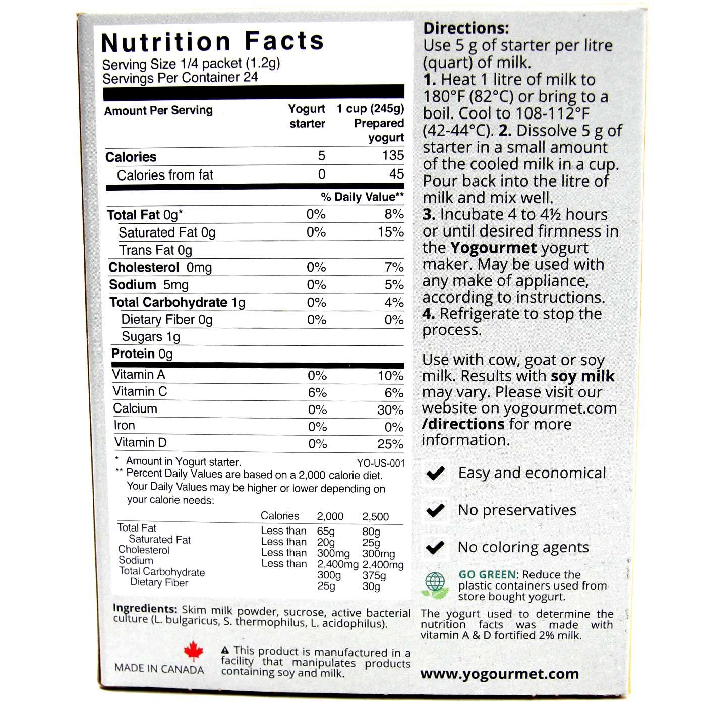 Notas: Contains 6 5 gram packets. No preservatives. No coloring agents. The yogurt used to determine the nutrition facts was made with vitamin A & D fortified 2% milk.
