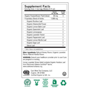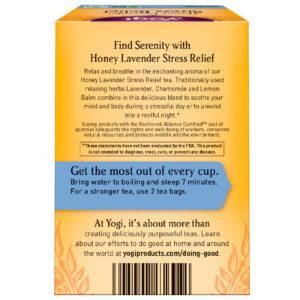 Relaxe e respire o encantador aroma de nosso chá de Alívio para o Estresse de Mel e Lavanda Ervas tradicionalmente usadas para relaxar, a Lavanda, Camomila e a Erva-cidreira são combinadas nesta deliciosa mistura para tranquilizar sua mente e corpo durante um dia estressante ou para relaxar para uma noite de descanso.