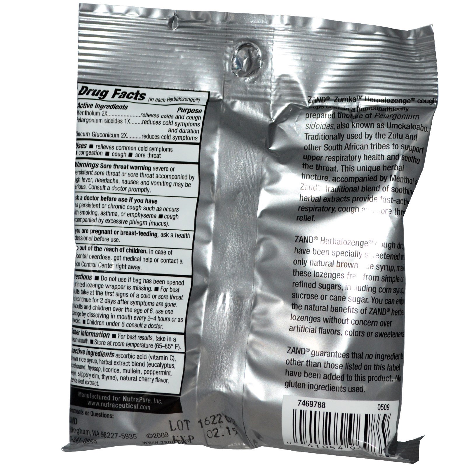 | Ingredientes Inativos ácido ascórbico (vitamina C), xarope de arroz marrom, mistura de extrato de ervas (eucalipto, horehound, hissopo, alcaçuz, mullein, menta, sálvia, olmo escorregadio, tomilho), sabor natural da cereja, extrato de folha de stevia. | |