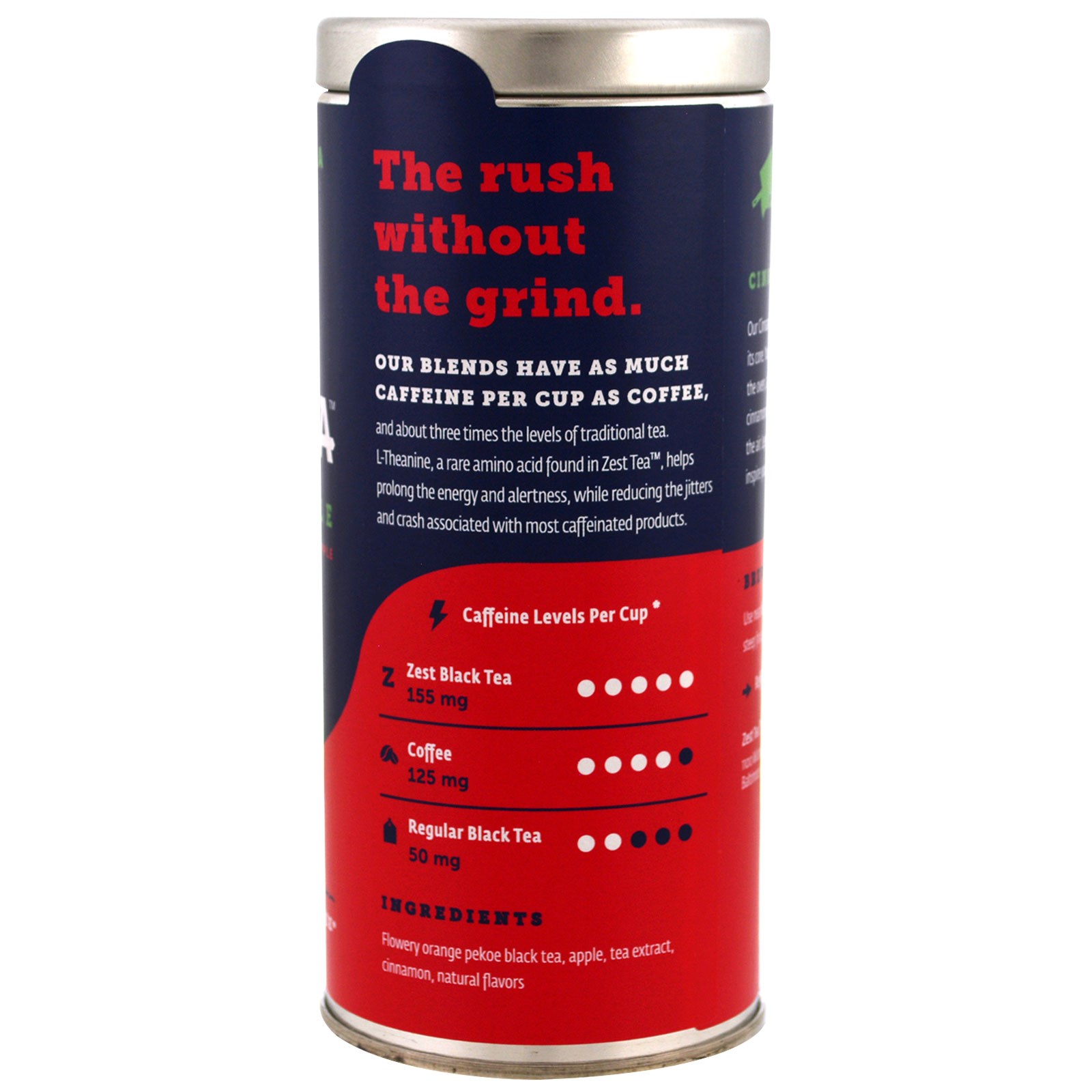 Our blends have as much as caffeine per as coffee, and about three time the levels of traditional tea. L-Theanine, a rare amino acid found in Zest Tea, helps prolong the energy and alertness, while reducing the jitters and crash associated with most caffeinated products.