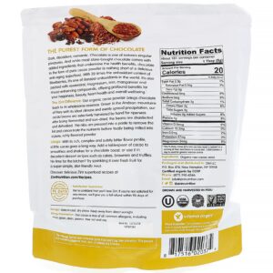 Escuro, elegante, romântico. O chocolate é um dos prazeres singulares da natureza. E embora a maior parte dos chocolates comprados em lojas contenha com ingredientes adicionais que inibem os benefícios à saúde, o chocolate na forma de cacau em pó puro não é nada menos do que um superalimento anti-idade delicioso. Com 20 vezes o teor de antioxidante dos mirtilos, ele é um dos antioxidantes mais completos do mundo. O produto também é enriquecido com resveratrol, magnésio, ferro, manganês e compostos que melhoram o humor, oferecendo benefícios profundos para a sua felicidade, beleza, saúde cardíaca e bem-estar de modo geral.