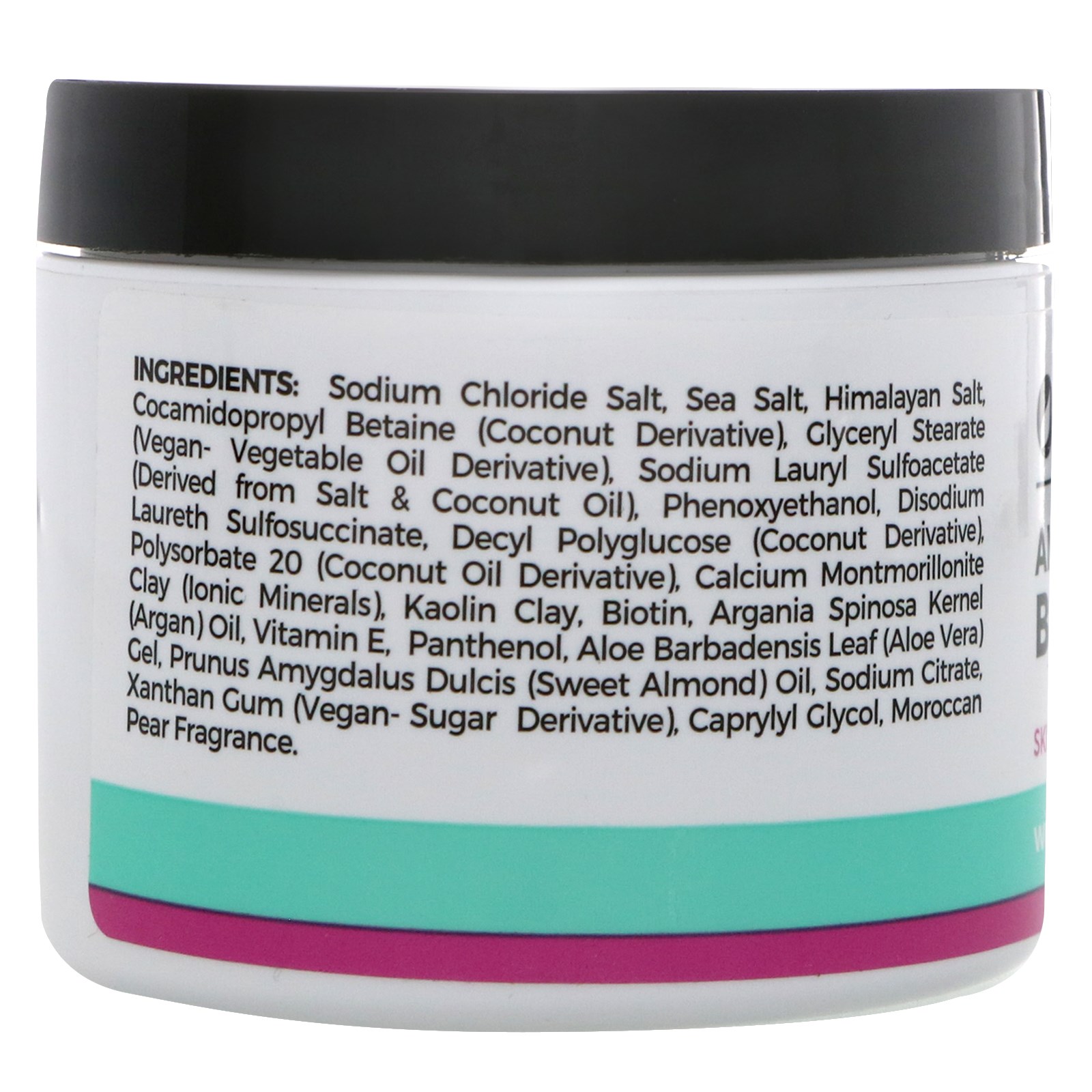Sodium chloride salt, sea salt, himalayan salt, cocamidopropyl betaine (coconut derivative), glyceryl stearate (vegan – vegetable oil derivative), sodium lauryl sulfoacetate (derived from salt & coconut oil), phenoxyethanol, disodium laureth suflosuccinate, decyl polyglucose (coconut derivative), polysorbate 20 (coconut oil derivative), calcium monotmorillonite clay (ionic minerals), kaolin clay, biotin, argania spinosa kernel (argan) oil, vitamin E, panthenol, aloe barbadensis leaf (aloe vera) gel, prunus amygdalus duclis (sweet almond) oil, sodium citrate, xanthan gum (vegan-sugar derivative), caprylyl glycol, moroccan pear fragrance.