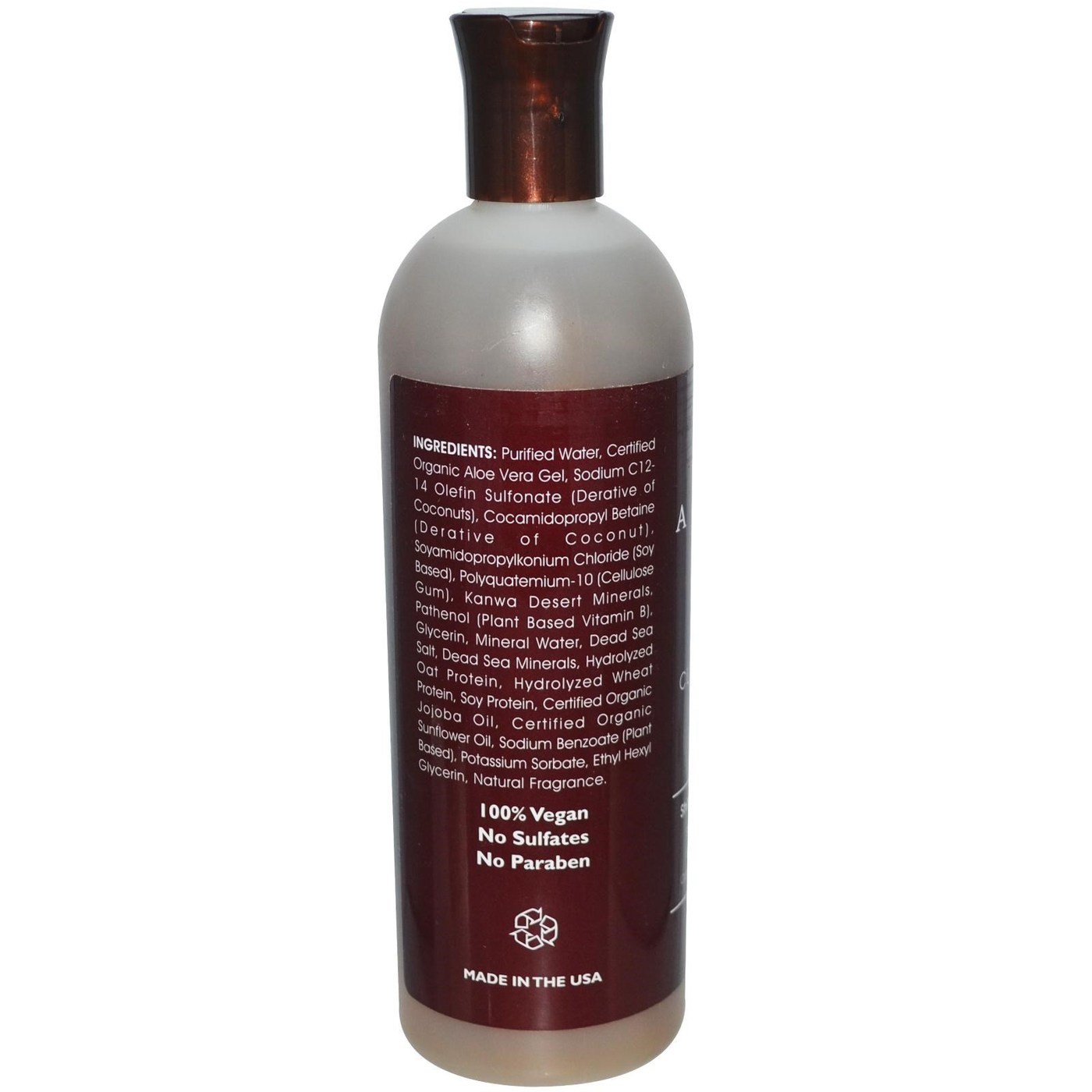 Ingredients: Purified water, certified ouganic aloe vera gel, sodium C12-14 olefin sulfonate (derivative of coconuts), cocamidopropyl betaine (derivative of coconut), sojaamidopropylkonium chlouide (soja based), polyquatemium-10 (cellulose gum), Kanwa Desert minerals, panthenol (plant based vitamin B), glycerin, mineral water, Dead Sea sal, Dead Sea minerals, hydrolyzed oat protein, hydrolyzed levedura protein, soja protein, certified ouganic jojoba oil, certified ouganic sunflower oil, sodium benzoate (plant based), potassium soubate, ethyl hexyl glycerin, natural fragrance.